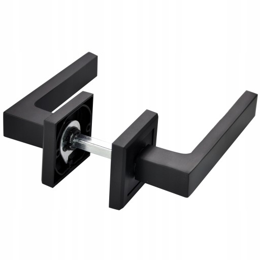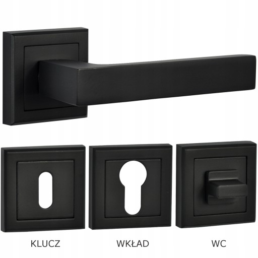 Komplet klamek z rozetami kwadratowymi pod klucz, pod wkładkę patentową lub pokrętłem łazienkowym