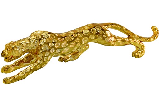 Błyszcząca i drapieżna figurka dekoracyjna geparda. Wykonana z niezwykłą starannością z żywicy, pokryta lakierem w stylowym złotym odcieniu. Będzie efektownym elementem dekoracyjnym każdego wnętrza zarówno minimalistycznego jak i wystroju glamour. Świetny pomysł na prezent.