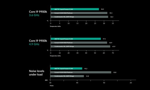 Chłodzenie typu wszystko w jednym spełnia wszystkie wymagania dotyczące chłodzenia - nawet w przypadku najpotężniejszych procesorów Intel® i AMD®. Bez problemu radzi sobie z rozproszeniem ponad 200 W ciepła, dzięki czemu Twój procesor może być chłodny nawet przy ekstremalnym overlockingu. Jeśli chodzi o konkurencyjne produkty wiodących producentów chłodzeń, Liquid Freezer II pozostawia ich w tyle pod względem wydajności i poziomu hałasu.