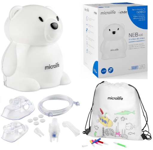 inhalacji. W zestawie maseczki dla dzieci i dla dorosłych, ustnik, filtry oraz aplikator