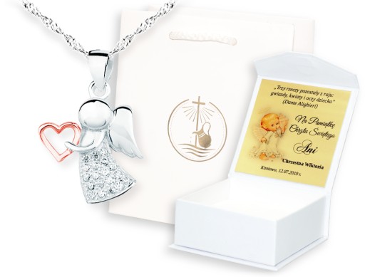 Piękny symboliczny Srebrny Aniołek Stróż z różowym sercem.
