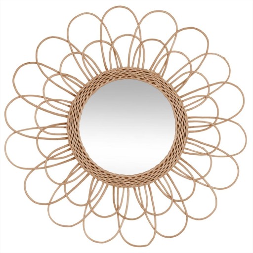 Okrągłe lustro ścienne z wiklinową, plecioną ramą w kształcie kwiatu. Praktyczny dodatek do salonu, sypialni lub przedpokoju, który jednocześnie stanowił będzie oryginalną dekorację. Wykonanie z naturalnego surowca oraz ciekawy design czynią z tego modelu idealne uzupełnienie zwłaszcza do wnętrz urządzonych w stylu boho lub skandynawskim.