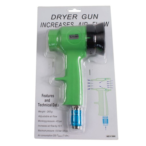 Skraca czas schnięcia lakierów, szczególnie na bazie wody. Idealna podczas lakierowania pojedynczych elementów samochodu, pozwala zaoszczędzić koszty ogrzania kabiny lakierniczej. W strumieniu powietrza, który tworzy pistolet lakiery wodne wysychają znacznie szybciej, dzięki szybkiemu odparowywaniu wody. Pistolet pobiera powietrze z instalacji oraz dodatkowo z otoczenia.