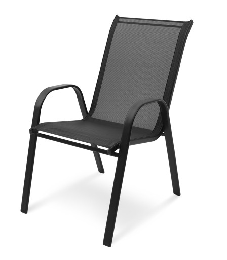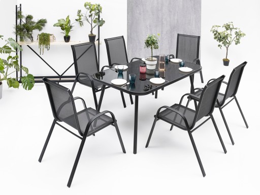 ZESTAW MEBLI OGRODOWYCH idealny do Twojego ogrodu. Stelaż został podwójnie lakierowany proszkowo, co idealnie przystosowuje ten produkt do zastosowania wewnątrz jak i na zewnątrz. Siedzisko krzesła oraz oparcie zostało zrobione z czarnego, elastycznego obicia tekstylnego tak, aby maksymalnie zwiększyć wygodę. Posiada ono dwa oparcia boczne. Użyte materiały nie wymagają częstej konserwacji, są odporne na warunki pogodowe i nie wymagają specjalnych środków do pielęgnacji. Nóżki są dodatkowo zaopatrzone w nakładki z tworzywa sztucznego. Stół posiada blat z czarnej hartowanej szyby o gr. 5 mm.