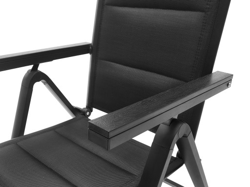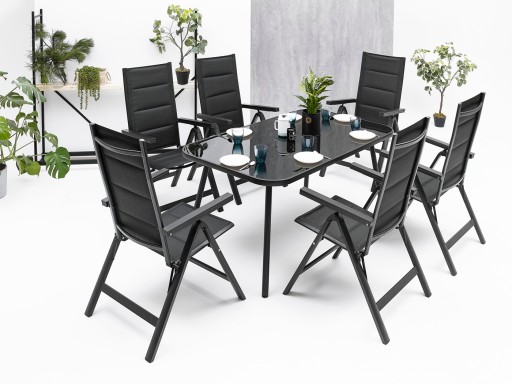 ZESTAW MEBLI OGRODOWYCH idealny do Twojego ogrodu. Stelaż został podwójnie lakierowany proszkowo, co idealnie przystosowuje ten produkt do zastosowania wewnątrz jak i na zewnątrz. Siedzisko krzesła oraz oparcie zostało zrobione z czarnego, elastycznego obicia tekstylnego z wypełnieniem miękką pianką tak, aby maksymalnie zwiększyć wygodę. Posiada ono dwa oparcia boczne wykonane z deski kompozytowej wpc. Użyte materiały nie wymagają częstej konserwacji, są odporne na warunki pogodowe i nie wymagają specjalnych środków do pielęgnacji. Nóżki są dodatkowo zaopatrzone w nakładki z tworzywa sztucznego. Stół posiada blat z czarnej hartowanej szyby o gr. 5 mm.