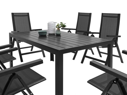 Konstrukcję stołu oraz krzeseł stanowi wysokiej jakości aluminium, malowane metodą proszkową. W oferowanym zestawie blat stołu wykonany jest z nieabsorbujących wody desek kompozytowych WPC, używanych między innymi do produkcji nowoczesnych systemów tarasowych i elewacji. Najważniejszym elementem konstrukcyjnym stołu są 4 profile aluminiowe w kształcie litery „U”. Ich zastosowanie sprawia, że po zmontowaniu całości stół jest wyjątkowo stabilny! Takie rozwiązanie pozwoliło na uzyskanie wolnej przestrzeni pod stołem i uniknąć niepotrzebnych dodatkowych konstrukcji przeszkadzających w wygodnym korzystaniu z mebli.