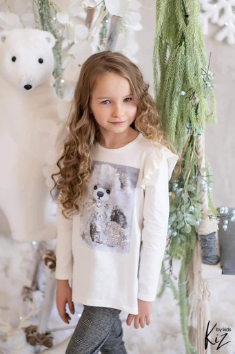 Dzianinowa bluzka w kolorze ecru z długim rękawem i delikatną grafiką z przodu oraz ozdobnymi falbankami w ramionach.