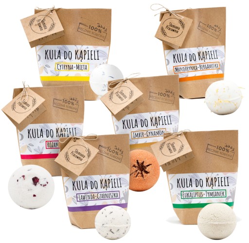 Zestaw składa się z 6 ręcznie robionych kul kąpielowych o wadze 70g.