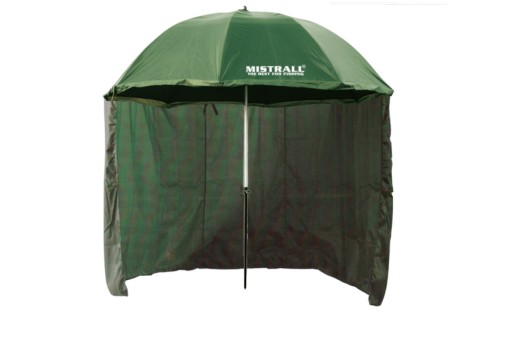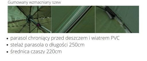 Duży parasol z osłoną dopinaną na zamek błyskawiczny dzięki któremu możemy spokojnie obserwować nasze wędziska, bez konieczności wystawiania się na działanie niekorzystnych warunków atmosferycznych takich jak deszcz czy wiatr. Wyposażony w regulowaną czaszę dzięki czemu kąt nachylenia możemy zmienić do 45 stopni. Osłonięty zamek błyskawiczny oraz wielowarstwowy materiał. Stelaż parasola o długości 250 cm, co daje w efekcie średnicę 220cm. Sztyca parasola zakończona ostrzem