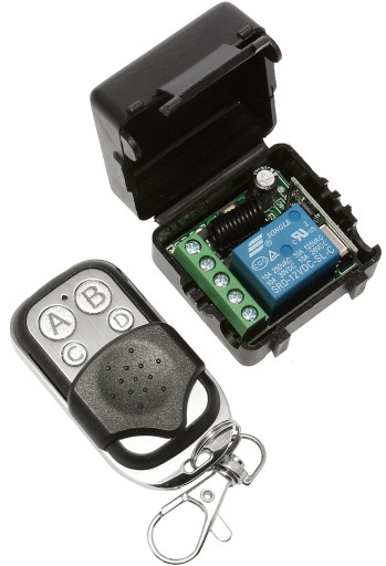 - Tryb PRZEŁĄCZNIKA JEDNO-PRZYCISKOWEGO: Przekaźnik włączany jest przyciskiem np. A, po puszczeniu przycisku pozostaje włączony do momentu ponownego wciśnięcia tego samego przycisku A na pilocie.