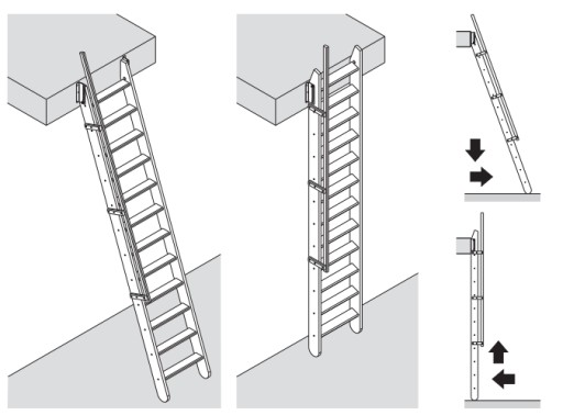 Schody zamontowane są do stropu na prowadnicy umożliwiającej ich przesuwanie z pozycji pionowej do ukośnej. Dzięki temu schody zajmują bardzo mało miejsca.