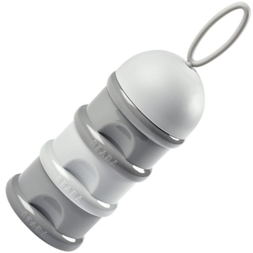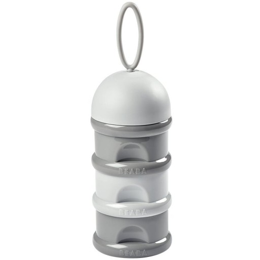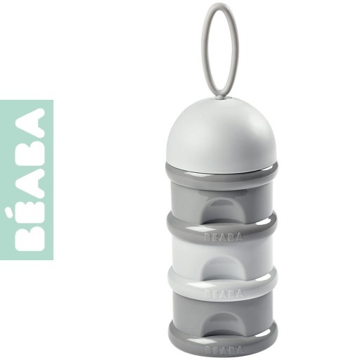 Kompaktowy zestaw 3 pojemników do przechowywania mleka w proszku francuskiej marki BEABA. Pojemniki (szary i dwa popielate) mają pojemność w sumie 270 ml (3x90ml).