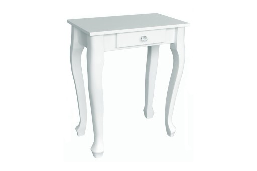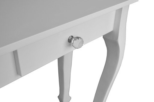 Rama, szuflada oraz nogi to lite drewno bukowe, blat wykonany z twardej płyty MDF, całość bejcowana i lakierowana lakierem termoutwardzalnym. Uchwyt kryształowy.