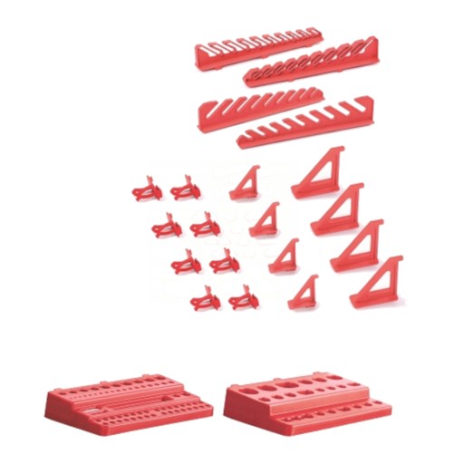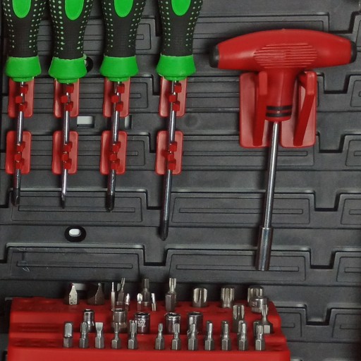 - W zestawie 42 sztuki kuwet, zestaw uchwytów do narzędzi (w sumie 40 sztuk), 6 półek oraz 10 tablic ściennych 386 mm x 390 mm (po złączeniu 193 cm x 78 cm),