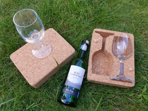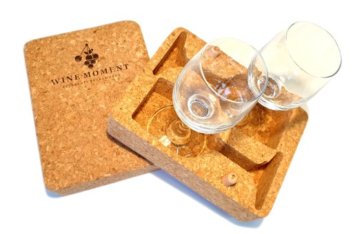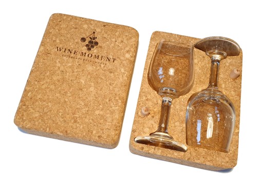 zestaw szklanych kieliszków zamkniętych w eleganckim pudełku z naturalnego korka.
