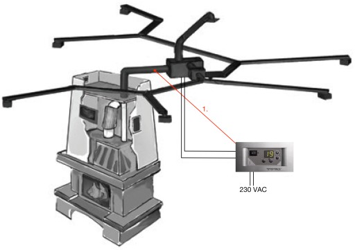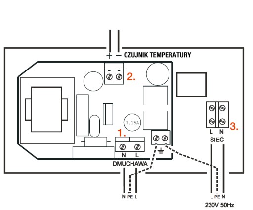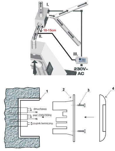 Najlepszym miejscem do montażu jest ściana obok kominka w pobliżu gniazda elektrycznego. Nie należy umieszczać regulatora w miejscu, gdzie temperatura może przekraczać 40°C. Połączenie zasilania i silnika dmuchawy należy dokonać zgodnie ze schematem elektrycznym znajdującym się w załączonej do regulatora instrukcji obsługi i montażu, Czujnik temperatury należy podłączyć wg zasady: przewód kolor czerwony (brązowy) zacisk „+”, przewód kolor biały (niebieski) zacisk „-”.