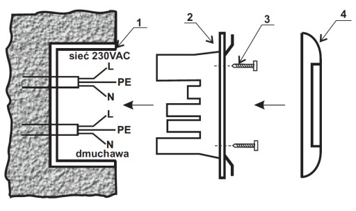 Na pulpicie po lewej stronie znajdują się cztery lampki sygnalizujące (1) stopień wysterowania. Przy wyłączonym wentylatorze wszystkie cztery lampki są wyłączone. Następnie wraz ze wzrostem obrotów zaczyna mrugać pierwsza lampka od dołu, najpierw krótkimi impulsami, później długimi. Przy dalszym wzroście obrotów lampka zaczyna świecić w sposób ciągły. Kolejne lampki sygnalizują jeszcze większe obroty wentylatora, aż do maksymalnych, gdzie wszystkie cztery lampki świecą w sposób ciągły. Po prawej stronie na pulpicie znajduje się lampka sygnalizująca obecność zasilania (3) doprowadzonego do regulatora oraz dwa przyciski (2), do zmiany obrotów wentylatora.