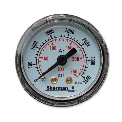 Manometr zegarowy do reduktorów butlowych spawalniczych MINI z rotametrem do ARGONU, CO2 Zakres pomiarowy: 0-315 bar. Średnica: 40 mm. Do reduktorów MINI z rotametrem.