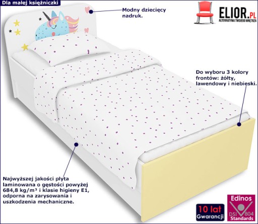 Twoja córeczka jest fanką słodkich jednorożców? Świetnie się składa! Wiemy, co cieszy małe księżniczki, dlatego zagłówek łóżka Lili 10X ozdobiliśmy obrazkiem ze wspomnianym już konikiem. Kolorową grafikę nanieśliśmy za pomocą nowoczesnej hybrydowej drukarki UV, dzięki czemu nadruk jest trwały, odporny na ścieranie i niezwykle atrakcyjny wizualnie, ale to nie koniec. Każda kobieta (nawet ta najmłodsza) uwielbia "przebierać" w kolorach. Kupując łóżko Lili 10X Twoja pociecha ma możliwość wyboru koloru frontu łóżka spośród zaproponowanych wyżej odcieni. Dopasuj łóżko Lili 10X tak, by odpowiadało upodobaniom i potrzebom Twojego dziecka.