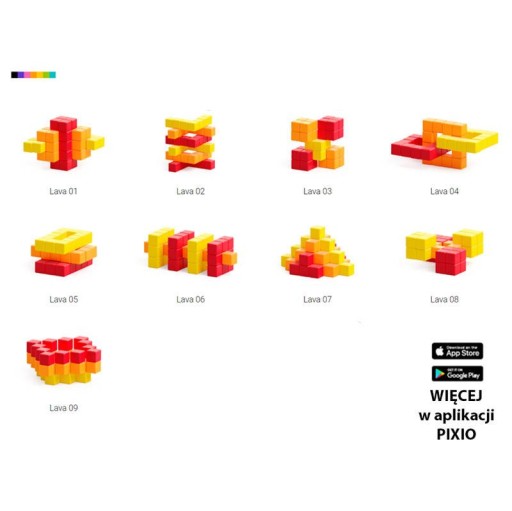 Zawiera klocki PIXIO w ilości 60 sztuk w kolorze czerwonym, pomarańczowym i żółtym.