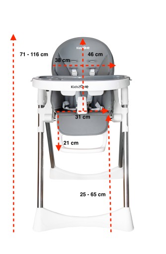 Krzesełko Kids Zone oferuje wszystkie funkcje i jakość. Jest ultralekkie i multifunkcyjne, rośnie wraz z Twoim dzieckiem, od narodzenia nawet do 5-6 roku życia. Podczas kilku pierwszych miesięcy krzesełko może być używane jako wygodny, relaksujący leżaczek. Od 6 miesiąca służy jako krzesełko do karmienia i zabawy. Później, już bez tacki, doskonale sprawdza się przy wspólnym stołowaniu z rodzicami. Natomiast maksymalnie obniżone krzesełko bez tacki posłuży jako fotelik starszemu dziecku.